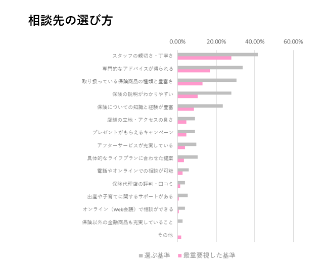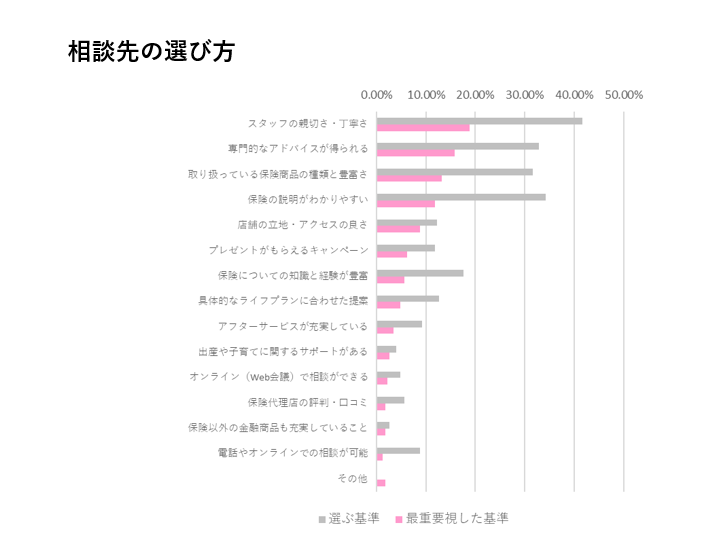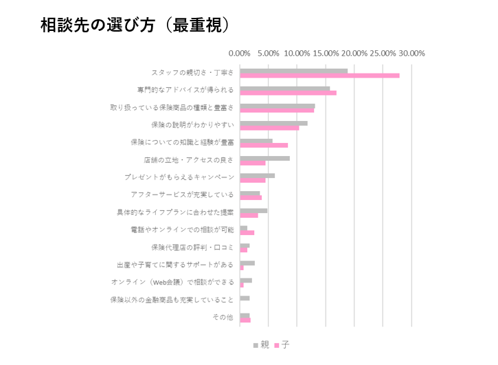 相談先選びの基準を見てみると、「スタッフの親切さ・丁寧さ」が最も多く、次いで「専門的なアドバイスが得られる」「取り扱っている保険商品の種類と豊富さ」が上位に並んでいる。スタッフの対応や保険商品の豊富さなどが重視されており、親と同様の傾向が見られる。