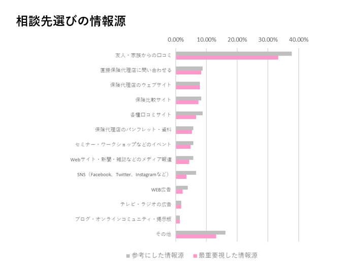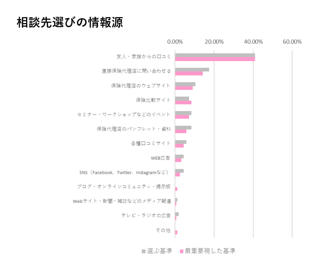 相談先選びの情報源では「友人・家族からの口コミ」が圧倒的に高く、ついで「保険代理店のウェブサイト」や「保険比較サイト」などWebサイトでの情報収集も多くなっている。