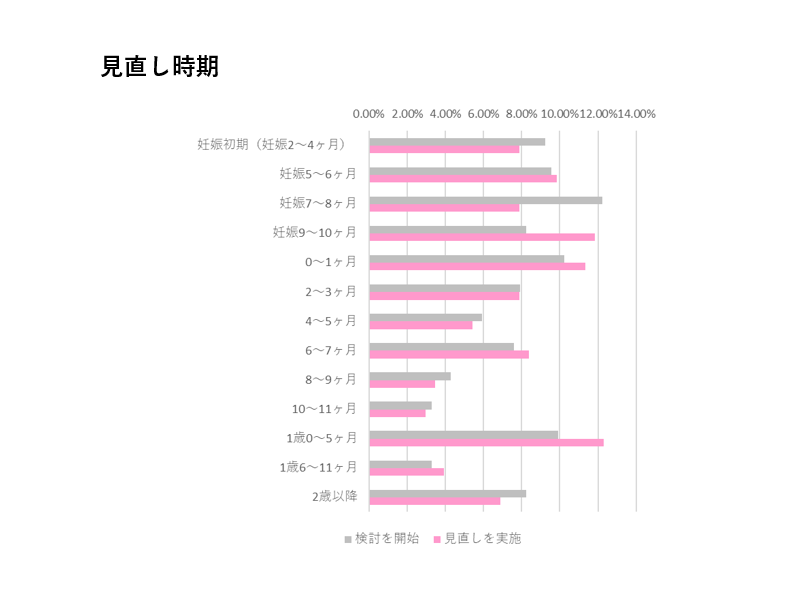 見直し時期を見てみると、検討を開始したのは妊娠7~8ヶ月を中心とした妊娠中が多く、実際の見直しは妊娠後期~出産後が目立つ結果となった。