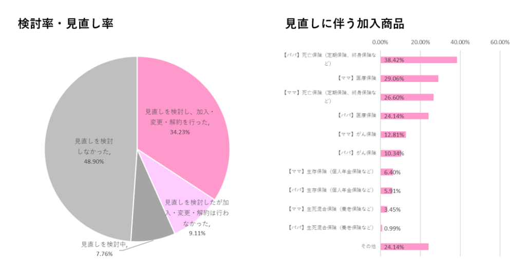 親の保険について「見直しの検討をし、加入・変更・解約を行った」人は約34%、「見直しを検討したが加入・変更・解約は行わなかった」人が約9%であり、何らかの検討をした人はあわせて4割以上となった。また、見直しに伴う加入商品はパパの死亡保険、ママの医療保険が上位である。