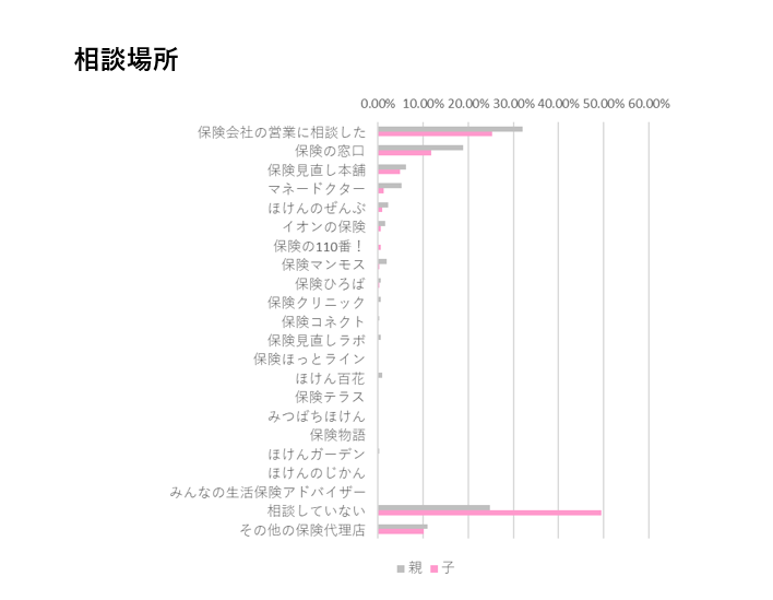 保険の相談場所については、親に比べて子の保険は相談せずに加入している割合が高くなっている。