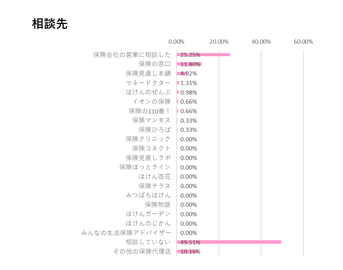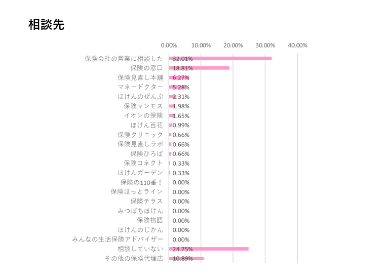 相談先は「保険会社の営業」「ほけんの窓口」「保険見直し本舗」が上位