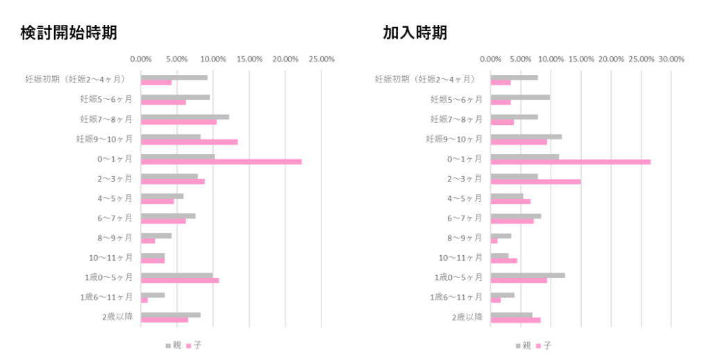 検討開始・加入共に、親の時期が子どもの時期よりも早い