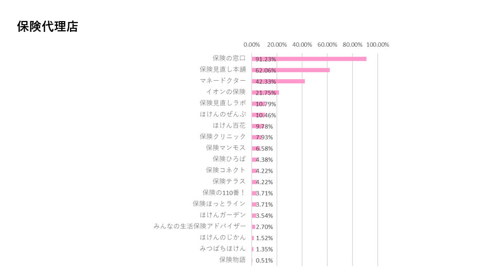 保険代理店の認知度の調査では「ほけんの窓口」が約91%で最上位、次いで「保険見直し本舗」が約62%となった。CMなどで露出の多い保険会社や保険代理店の認知度が高く、影響力の大きさが伺える。