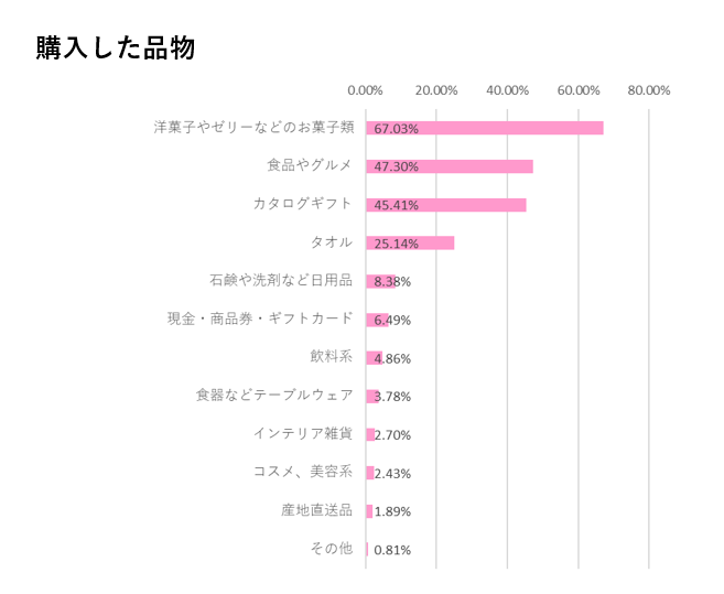内祝いとして選ばれる商品の調査では、「洋菓子やゼリーなどのお菓子類」や「食品・グルメ」などの食べ物が上位に並んだ。また先方が選べるなどのメリットを持つ「カタログギフト」も人気があることがわかる。
