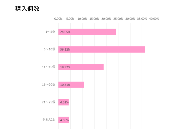 購入個数の調査では「6~10個」が最も多く、次いで「1~5個」が続いた。多くの人が複数の内祝いを贈っていることがわかる。