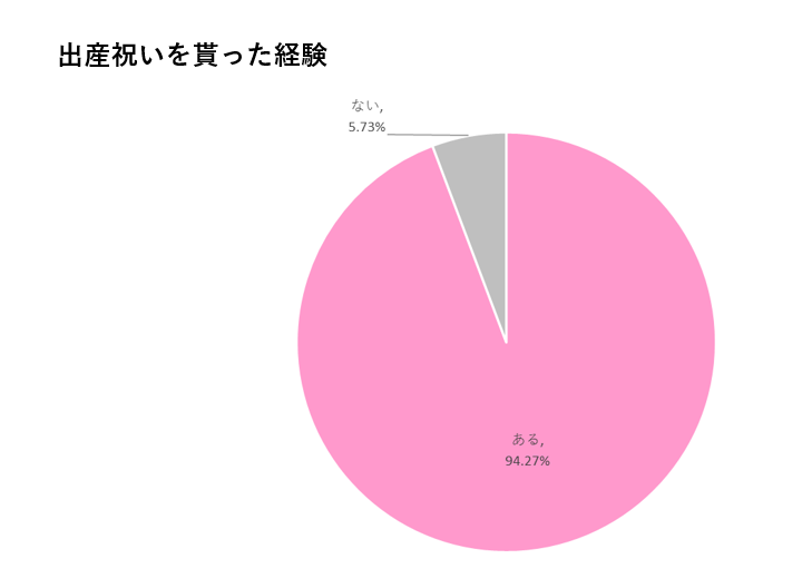 出産祝いを貰った経験についての調査では、約94%が貰った経験が「ある」と回答。アンケートに回答したママパパの9割以上が出産祝いを貰ったことがあることがわかった。