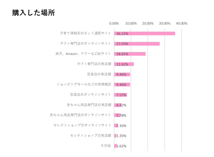 購入場所の調査では、ECサイトが上位を占めており、 特に「子育て情報系のネット通販サイト」が1位となっている。また実店舗としてギフト専門店の利用も好まれている。
