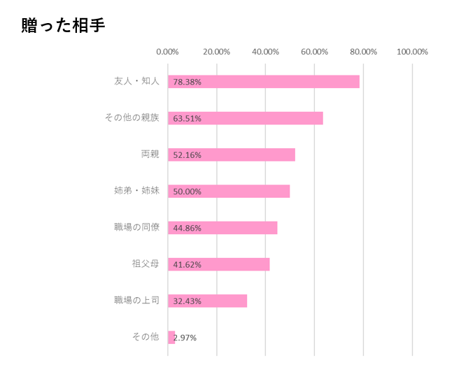 内祝いの贈り先としては「友人・知人」が78%と最も多く、次いで「その他の親族」「両親」が続く形となった。両親や姉弟・姉妹には贈らない人も多いことが伺える。