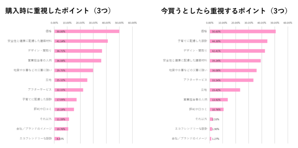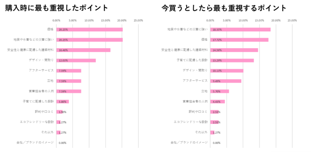 最も注目すべきは最重要視するポイントの変化。購入時は「価格」が最も重視されていたが、購入後は「災害への強さ」が第1位に浮上し、価格を上回った。子育て世代の安全性への意識の高さが顕著に表れている。