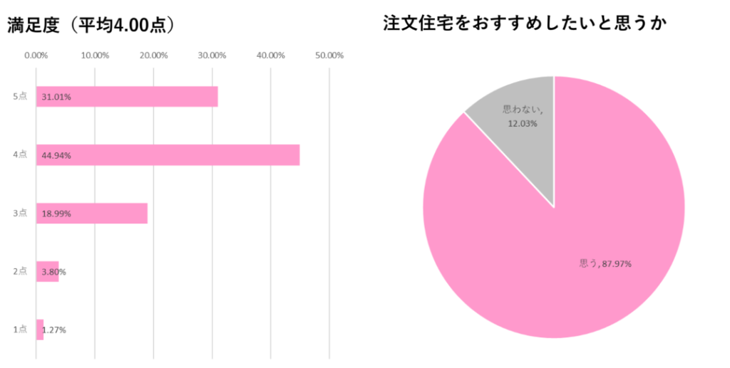 満足度調査では、5段階評価で4以上の高い満足度を示した人が約75%に達した。平均満足度は4.00点と比較的高水準であり、購入者の約88%が他の人に注文住宅を推奨したいと回答している。