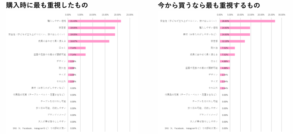 購入時の選択基準と今から購入する場合の選択基準を最重視項目に絞って調査したところ、購入時は「価格」がトップでしたが、実際の利用を経て「安全性」がトップにランクアップしました。特筆すべきは、購入時には0%だった「素材」が、利用後の調査では「価格」と同率2位にまでランクアップしており、実際の使用経験によって選択基準が大きく変化することがわかりました。
