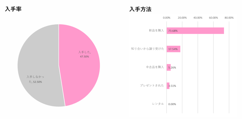 ハイチェアの入手については「入手した」と回答した人が47.5%と約半数となりました。入手方法の調査では、入手した人のうち「新品を購入」した人が7割強と最も多く、続く「知り合いから譲り受けた」が2割弱という結果になりました。