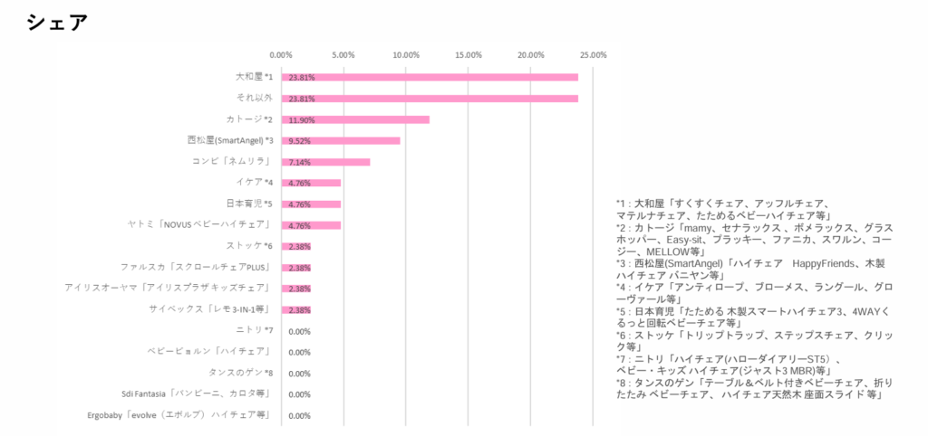 シェアについての調査では、「大和屋」が最も多く20%超を占め、次いで「カトージ」「西松屋(SmartAngel)」が続く形となりました。「その他」の占める割合も高く、多様なプレーヤーが市場に参入している状況がうかがえます。