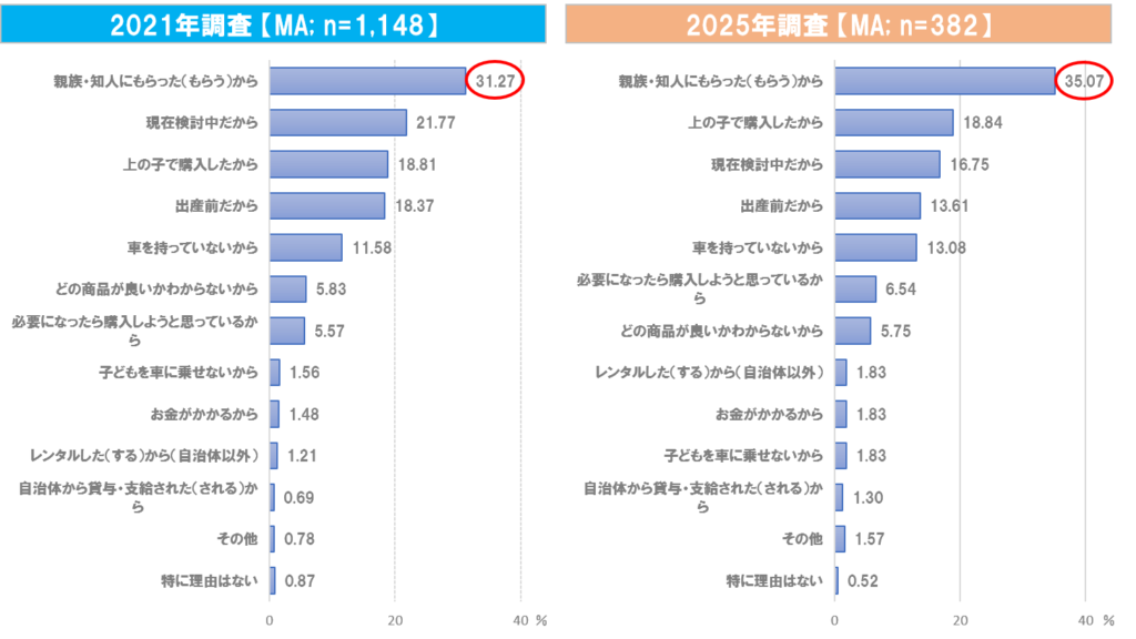 購入していない理由として最も多かったのは「親族・知人にもらった(もらう)から」であり、2021年は31.27%、2025年は35.07%と、いずれも3割を占めた。また、「上の子で購入したから」という回答は2021年の18.81%から2025年には18.84%とほぼ横ばいであり、一定数の家庭が同一のチャイルドシートを複数の子どもに使用していることが分かった。