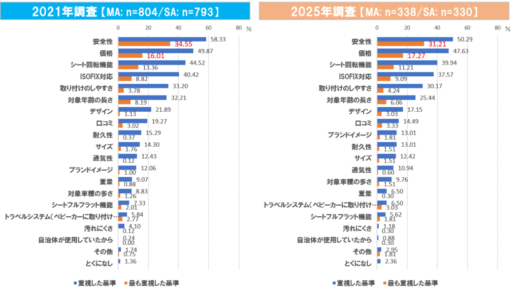 2025年調査における複数回答での重視基準は、「安全性」(50.29%)、「価格」(47.63%)、「シート回転機能」(39.94%)、「ISOFIX対応」(37.57%)の順で多く、安全かつ使いやすく、リーズナブルな製品が求められていることがわかる。