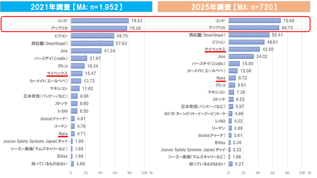 2025年調査において、認知度が高かったメーカーは「コンビ」(70.69%)および「アップリカ」(68.75%)であった(図3)。2021年との比較で特筆すべきは、「サイベックス」や「Nuna」といった海外ブランドの認知度が大きく上昇している点である。特に「サイベックス」は2021年の15.47%から2025年には42.50%へと大幅に上昇し、「Nuna」も4.71%から9.72%へと拡大しており、日本市場における海外ブランドの存在感が増している。