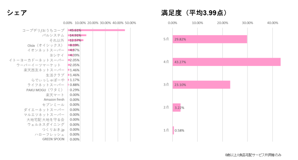 利用サービスのシェアを見てみると、「コープデリ/おうちコープ」が約45%で最多となった。次いで「パルシステム」「Oisix」が続くが、それ以外のサービスも一定の支持を得ており、分散傾向がみられる。満足度は平均3.99点と5には届かないが、サービスへの信頼感が構築されており、継続的利用が期待できる安定的な満足度であると言えるだろう。