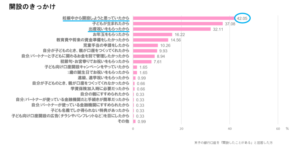 口座を開設したきっかけとしては、「妊娠中から開設しようと思っていたから」が最も多く約4割を占めており、 次いで「出産祝いをもらったから」「お年玉をもらったから」など、出産・育児にまつわるお金に関わるイベントが契機となっている。