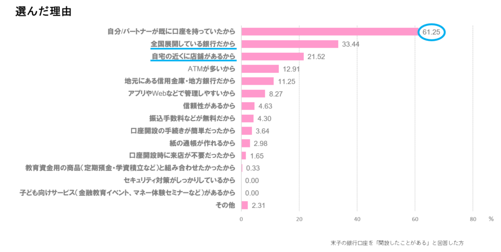 口座を開設した金融機関を選んだ理由については、「自分/パートナーが既に口座を持っていたから」が約60%と圧倒的である。加えて、「全国展開しているから」「自宅近くに店舗があるから」などの利便性も上位に挙げられている。