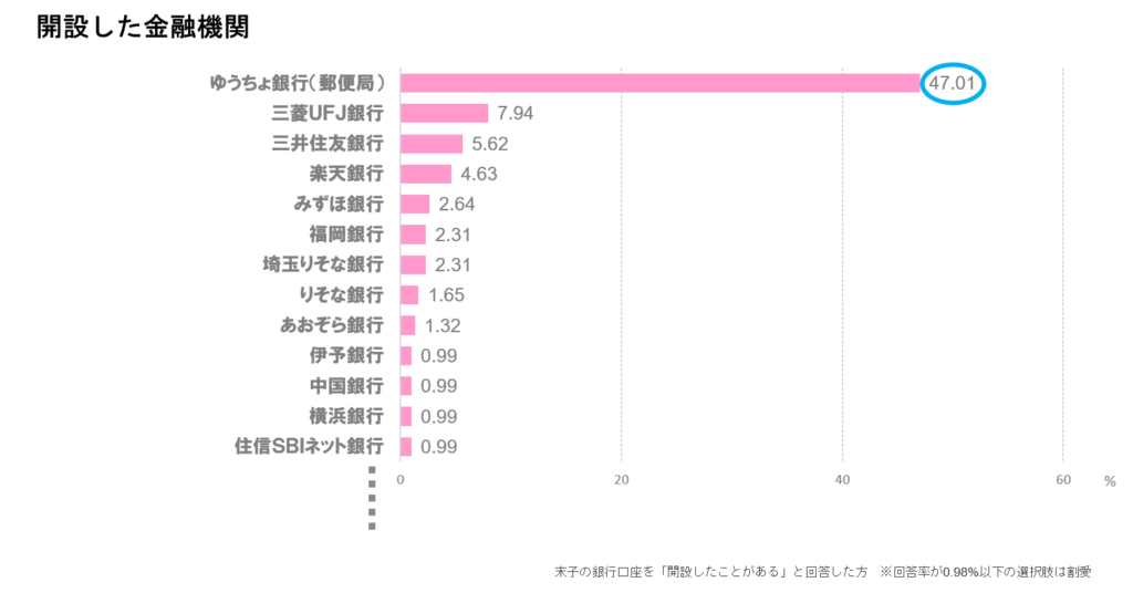 初めて子ども名義の口座を開設した金融機関としては、「ゆうちょ銀行」が最も多く約47.01%を占めた。以下、「三菱UFJ銀行」(7.94%)、「三井住友銀行」(5.62%)と続いている。ゆうちょ銀行の高い支持率は、全国展開と店舗網の広さ、そして信頼性に対する評価によるものと考えられる。