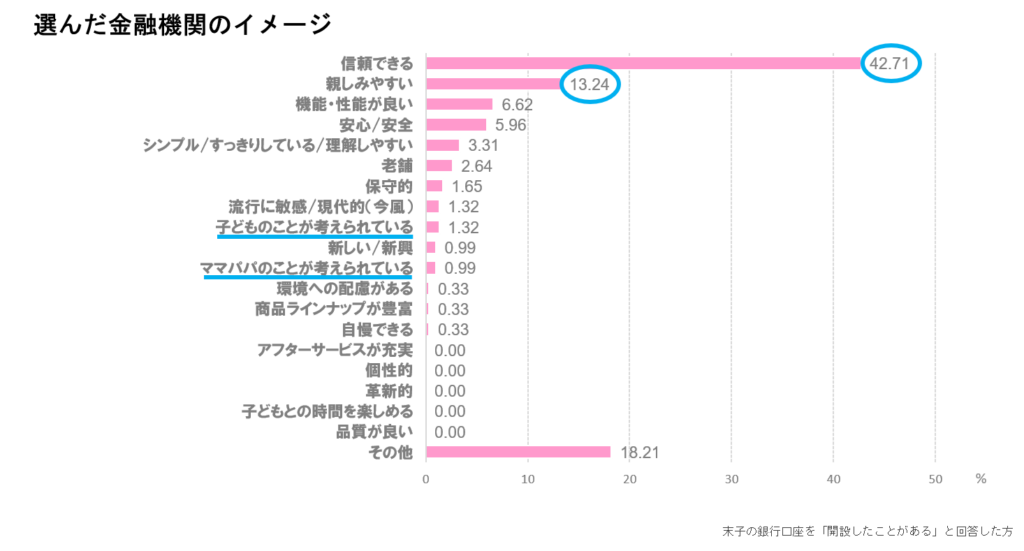 また、ネット銀行である楽天銀行が4位にランクインしている点から、デジタル志向の親が一定数存在することも確認できる。今後、子育て層に対するオンラインサービスの強化やアプリの使いやすさなどが、選定理由に占める比重を高める可能性がある。