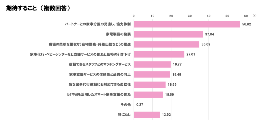 家事負担軽減に最も期待されているのは、「パートナーとの家事分担の見直し、協力体制」(約57%)であり、「家電製品の進化」(約37%)や「職場の柔軟な働き方の推進」(約35%)が上位を占め、技術の進歩や社会的制度に期待していることがわかった。さらに、「家事代行サービスの普及と価格の引き下げ」(約27%)や「信頼できるスタッフとのマッチングサービス」(約20%)も挙げられ、家事代行サービスといった「他人に頼るシステム」への需要が一定数あることが示された。