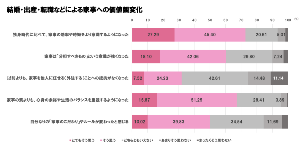 結婚・出産・転職などのライフステージ変化により、「家事の効率化」や「生活バランスの重視」がより求められるようになった。一方で、家事を他人に任せることへの抵抗感は依然として強く、価値観が行動につながっていないことが示される。
