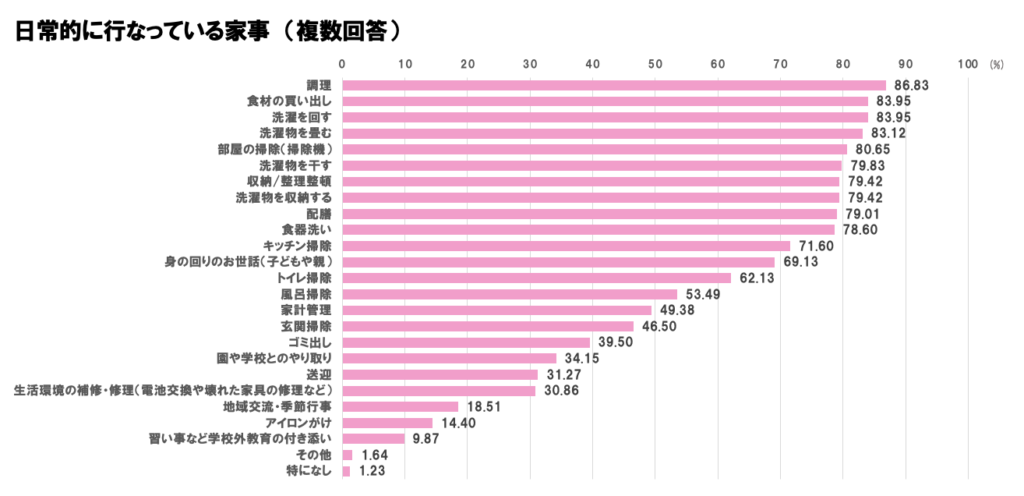 日常的に行なっている家事として、「食事の支度」「洗濯」「掃除」がいずれも8割を超えており、生活の基盤を支える家事として女性が担っている傾向が明らかになった。一方で、「トイレや風呂などの水回りの掃除」や「ゴミ出し」は、生活に不可欠な家事であるにも関わらず、実施率が相対的に低く、家事の内容ごとに分担されている様子が読み取れる。