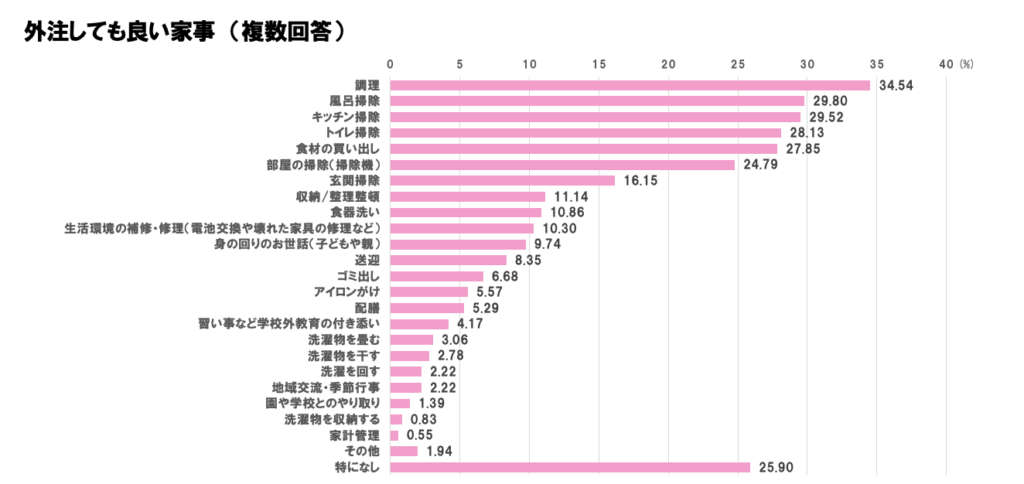 「外注してもよい家事」としては「調理」が最多で約35%。メニューの考案や栄養管理など、精神的・技術的負担の大きさが関係している可能性がある。また、「片付け」や「風呂掃除」などの汚れに関する作業も上位に入っており、「やりたくない・時間がかかる・技術を要する」家事における代行サービスのニーズが高いと読み取れる。