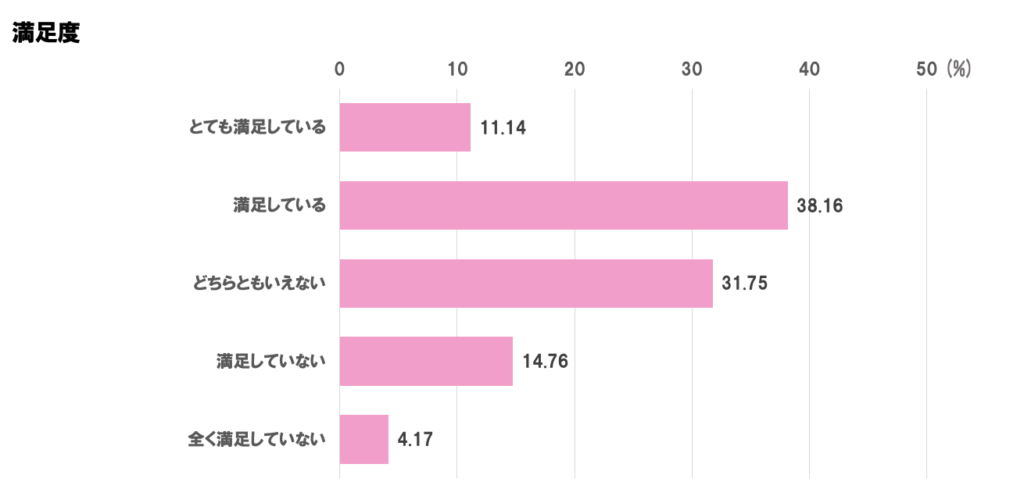 家事分担に対する満足度は、「満足している」が約50%と半数にとどまり、「満足していない」と回答した人は約19%であった。多くの家庭で、ある程度の協力体制が築かれている一方で、依然として家事の負担が一方に偏っているケースも少なくないことを示している。