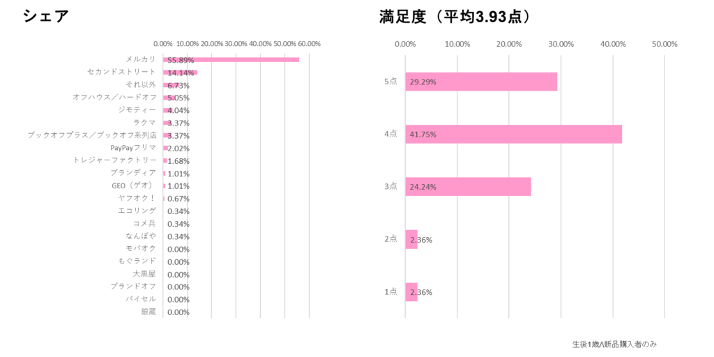 圧倒的なシェアを誇るのは「メルカリ」(55.89%)。手軽さ・ユーザー層の多さに加え、アプリの使いやすさなどが魅力と考えられる。2位の「セカンドストリート」(14.14%)は、実店舗における取り扱い商品の幅広さとデータベース化された買取体制で支持を得ており、上位2サービスで約7割の利用者を押さえている状況である。また、「満足度平均3.93点」、「他人にすすめたい」が約85%と、利用者の多くが高評価なことから、実体験に基づいた口コミやシェア行動が広がることで今後ますます市場拡大が期待できる。