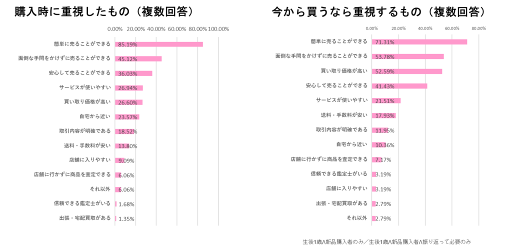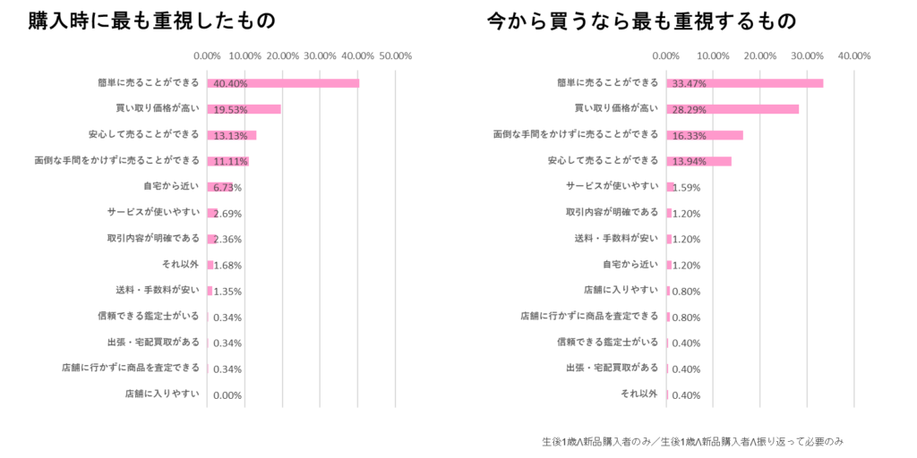 最重視項目になると、「簡単に売ることができる」の次に「買い取り価格が高い」がランクインすることから、買取価格への期待値が高くなることがうかがえる。