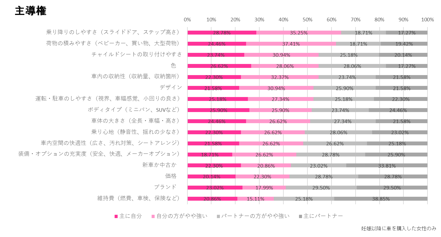 夫婦間でどちらが主導して各項目を決めたかというデータをさらに詳しく見ると、母親が特に主導権を握る傾向が強いのは、「乗り降りのしやすさ」「荷物の積みやすさ」「チャイルドシートの取り付けやすさ」といった、子育てにおける実用性と直結する項目であった。
