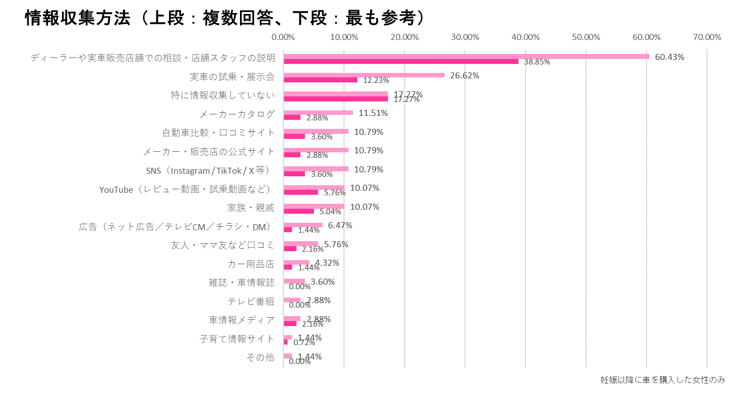 母親が参考にした情報源(複数回答可)では、「ディーラーや実車販売店舗での相談・店舗スタッフの説明」が60.43%で最多であった。さらに、その中から「最も参考にした情報源」を一つだけ選んでもらったところ、同項目が38.85%と突出し、リアルな体験が最終判断に強く影響していることが示された。次いで参考にされたのは「実車の試乗・展示会」(26.62%)であった。このデータは、カタログやWebサイト、SNSで情報収集を行いつつも、高額な買い物であるファミリーカーの購入においては、最終的に実物を見て、触れて、専門家の話を聞くというリアルな体験が意思決定を大きく左右することを示している。