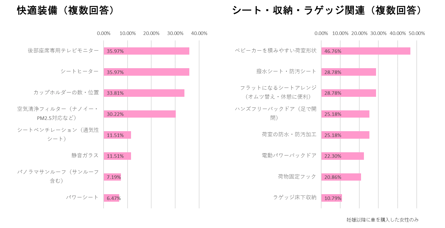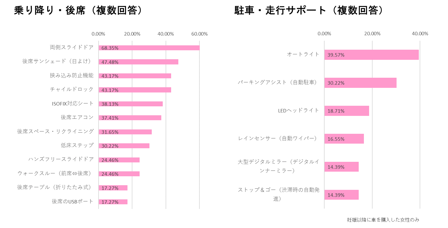 この結果から、妊娠後に購入をした自動車を日常的に利用するメインドライバーが母親がであろうこと、そして、自分だけでなく大切な子どもの命を守るための安全機能や、日々の運転の負担を軽減する便利機能への関心が非常に高いということが推測される。