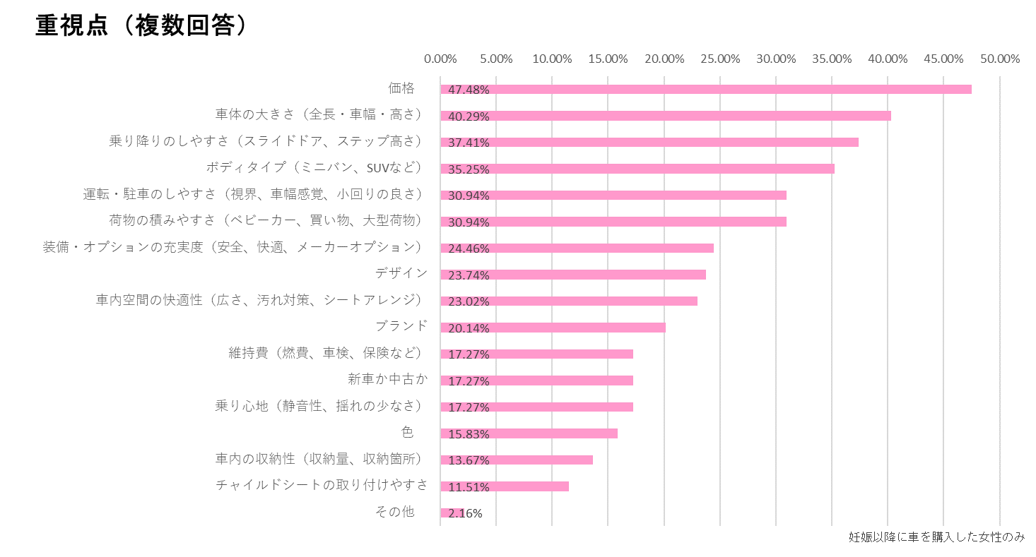 母親が車を購入する際に重視した点としては、「価格(47.48%)」がトップ、次いで「車体の大きさ(40.29%)」、「乗り降りのしやすさ(スライドドア、ステップ高)(37.41%)」が続いた。