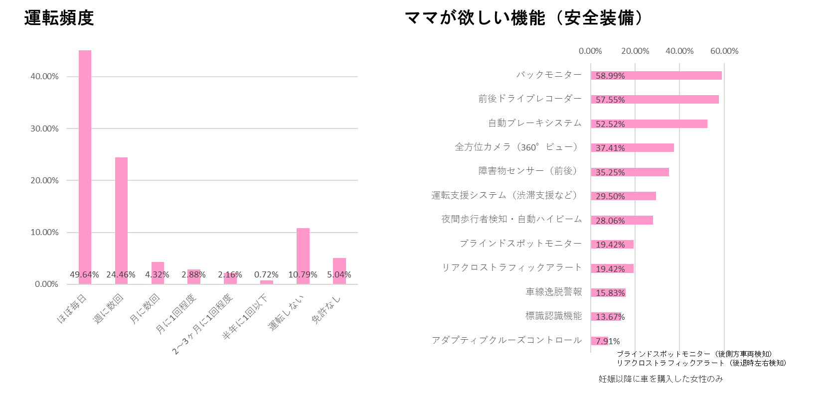 母親の運転頻度は「ほぼ毎日」が49.64%と約半数を占めており、日常的な移動手段として車が不可欠であることがわかる。その上で、母親が欲しい機能を見ると、安全機能では「バックモニター(58.99%)」「前方ドライブレコーダー(57.55%)」「自動ブレーキシステム(52.52%)」が、便利な機能では「両側スライドドア(68.35%)」や「ベビーカーを積みやすい荷室形状(46.76%)」へのニーズが高いことが明らかになった。