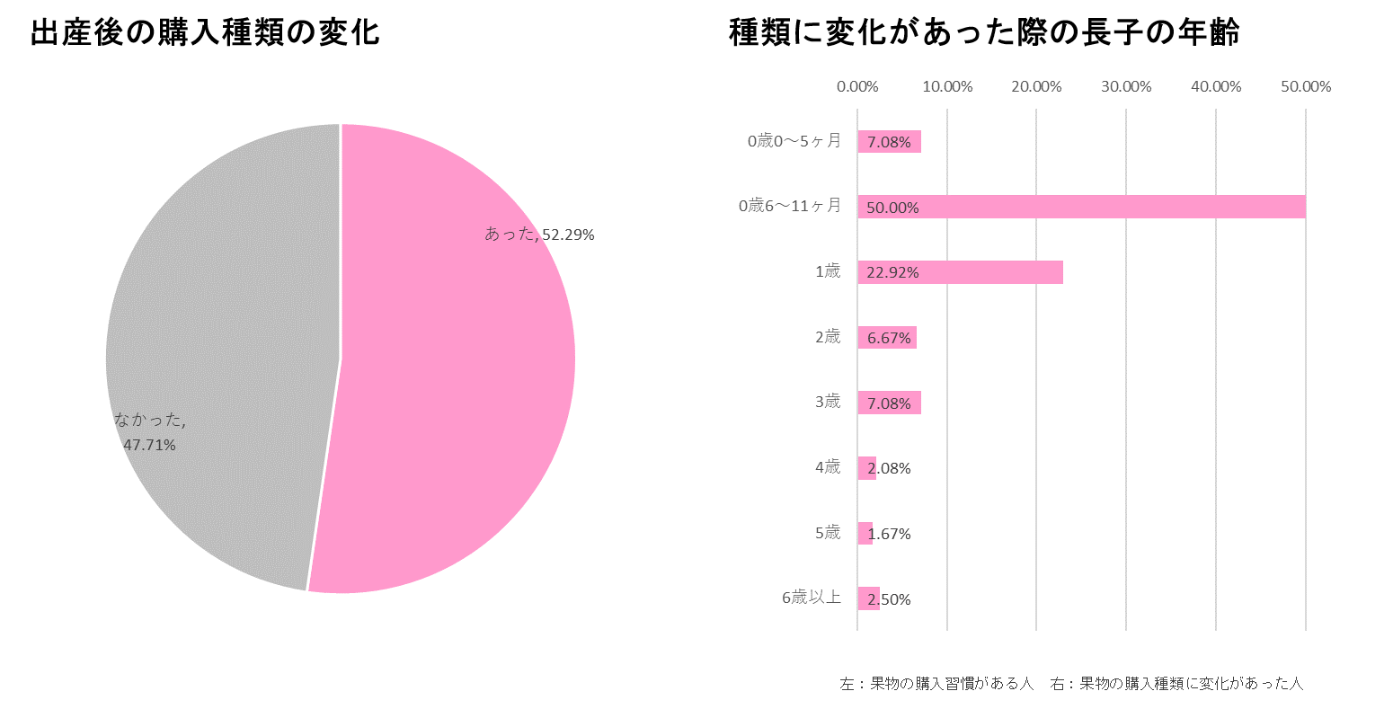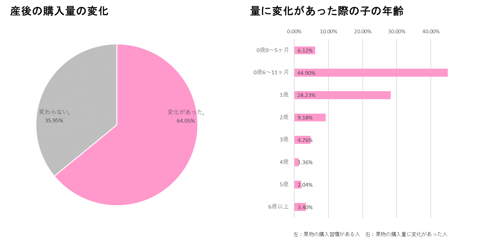 出産を機に果物の「種類」や「量」に大きな変化が生じることが明らかになった。具体的には、52.29%の家庭で購入する果物の種類が変わり、64.05%以上の家庭で購入量に変化が生じた。この変化は、特に「0歳6ヶ月~11ヶ月」で顕著に現れ、子どもが離乳食を始めるタイミングに合わせて果物の役割が変わることが影響していると考えられる。このライフステージをターゲットにしたマーケティングが、購買意欲を喚起する有効な手段となるだろう。