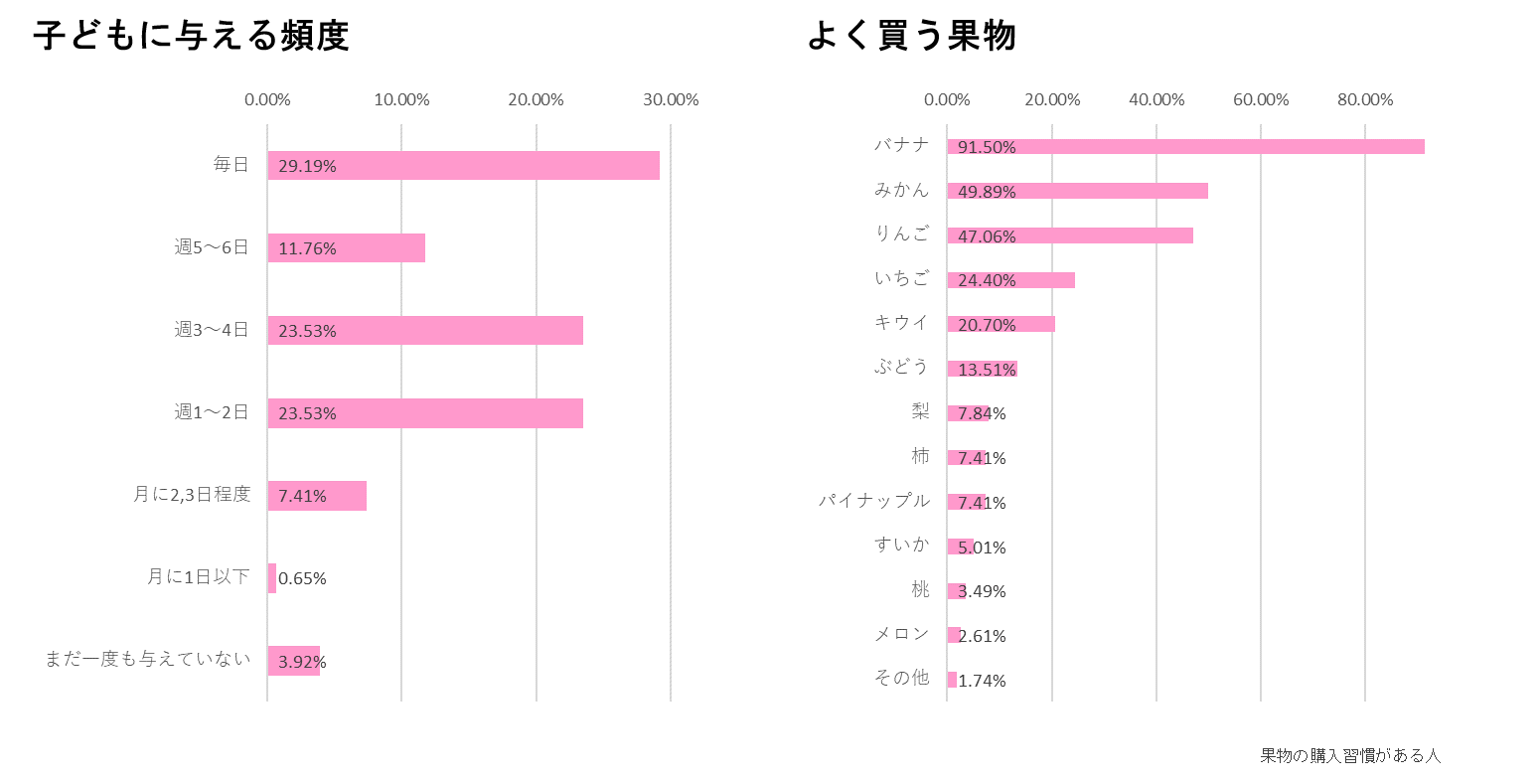 子どもに与える頻度は、「毎日」が最も多く(29.19%)、次いで「週1~2回」(23.53%)であり、9割以上の家庭が週1回以上果物を与えていることがわかった。購入理由は、「子どもが好きだから」が約74%で最も多く、「ビタミンがとれる」(37.91%)や「子どもの健康に良い」(31.37%)が主な理由として挙げられた。この結果は、育児において子どもの嗜好を重視する傾向や、健康管理のために果物を取り入れたいという保護者の意識を反映している。