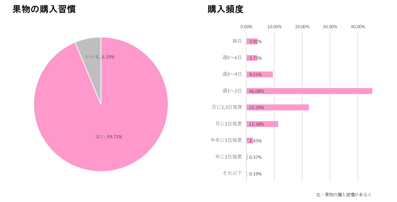 子育て世帯における果物購入習慣は定着しており、93.71%の家庭が日常的に果物を購入している。購入頻度では「週1~2回」が最も多く(46.08%)、全体の63%以上が週1回以上果物を購入することが分かった。果物は、子どもの健康や食育の観点から、家庭の食卓に欠かせない存在であり、非常に高いリピート率を示している。