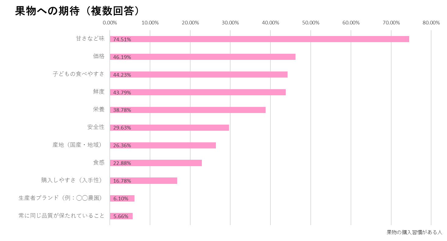 果物を選ぶ際に最も重視される要素は「甘さなど味(74.51%)」、次いで「価格」(46.19%)や「子どもの食べやすさ」(44.23%)であった。