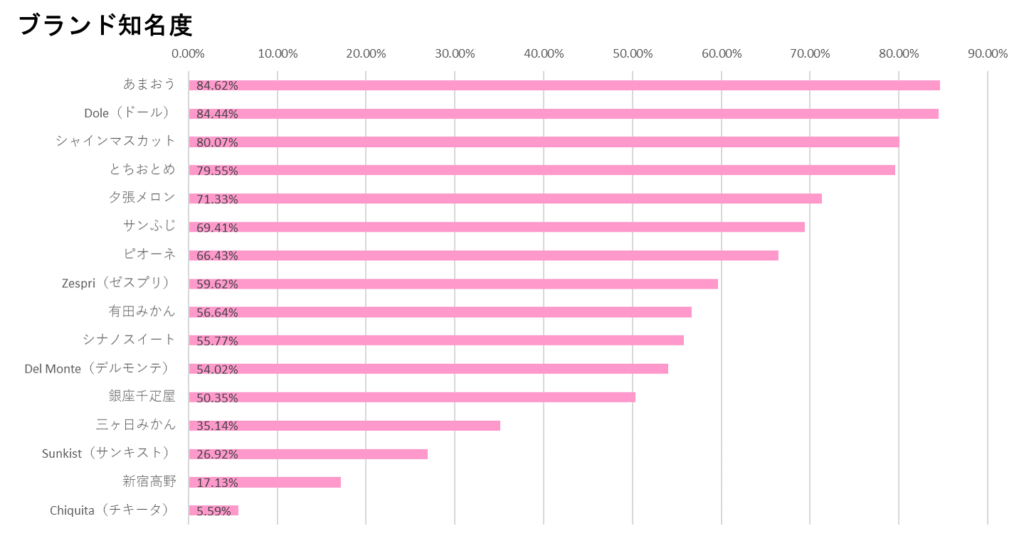 果物のブランド認知度には多寡が見られ、特に「バナナ」や「いちご」など、日常的に接触機会の多い果物については、比較的高いブランド認知が確認された。具体的には、いちごの「あまおう」「とちおとめ」、バナナの「Dole」、シャインマスカット、夕張メロンなどが上位に並んだ。ブランドは「顧客との約束」とも換言される。これら上位のブランドは、その品質が子育て層にも認められ、認知されたブランドともいえよう。