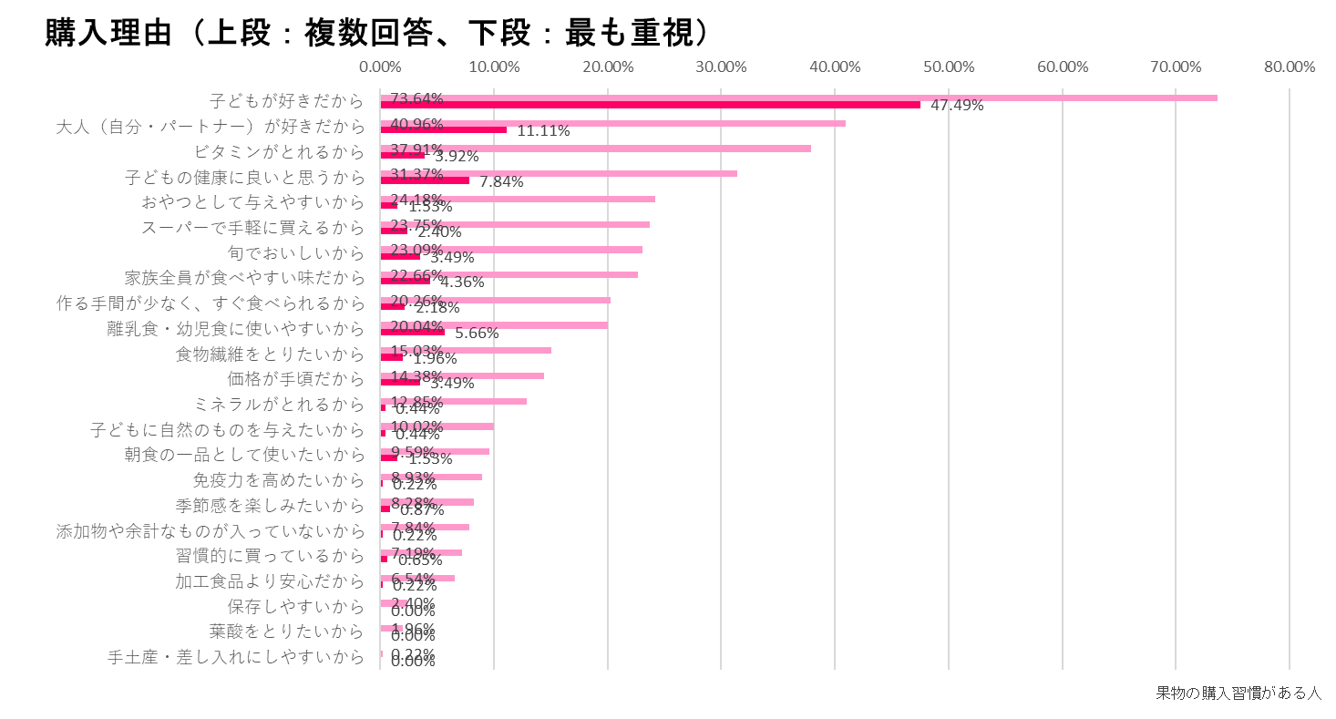 一方、子育て世帯においては、果物はビタミン補給などの「子どもの健康管理」や、多様な味覚を形成する「食育」の観点から、日々の食卓に欠かせない重要なカテゴリーである。そのため、多くの保護者にとって、子どもの成長というライフステージの変化に合わせて食材選びの基準をアップデートすることは重要事項と考えられる。
