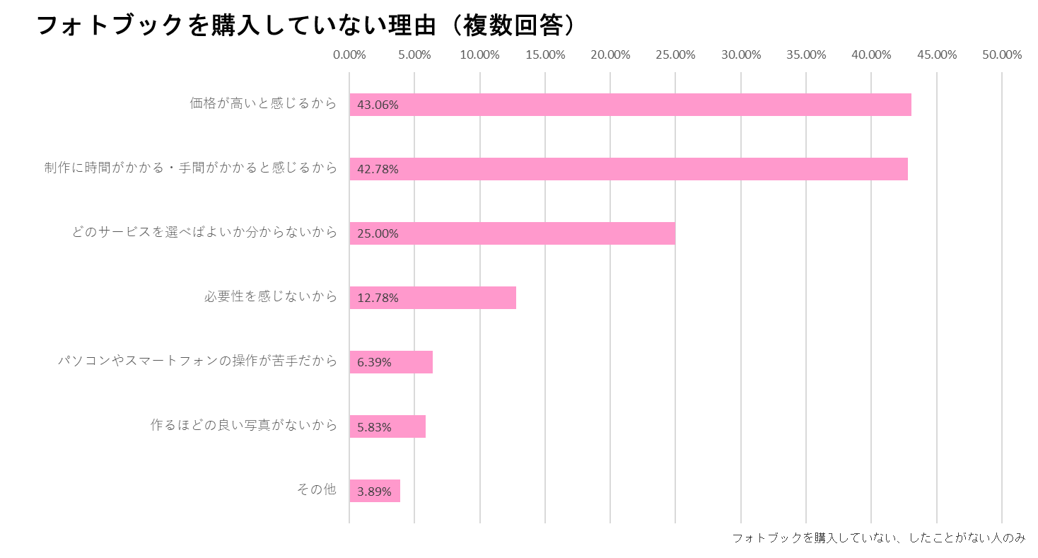 フォトブック未購入者の理由では、「価格が高いと感じる」が43.06%、「制作が面倒・手間がかかる」が42.78%と上位を占めた。