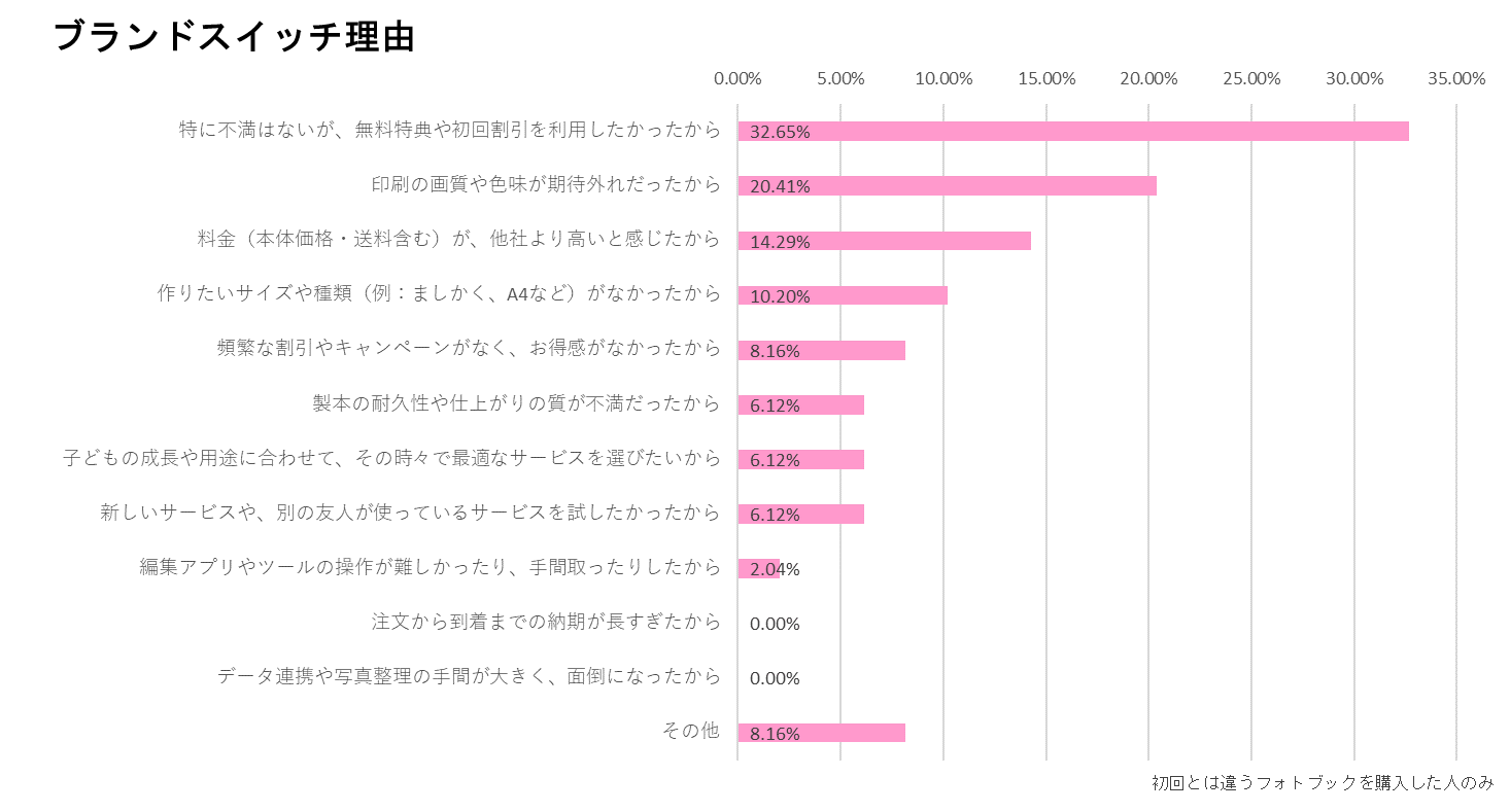 ブランドスイッチの理由は、「特に不満はないが、初回の特典利用がしたかった」が32.65%と最多であった。