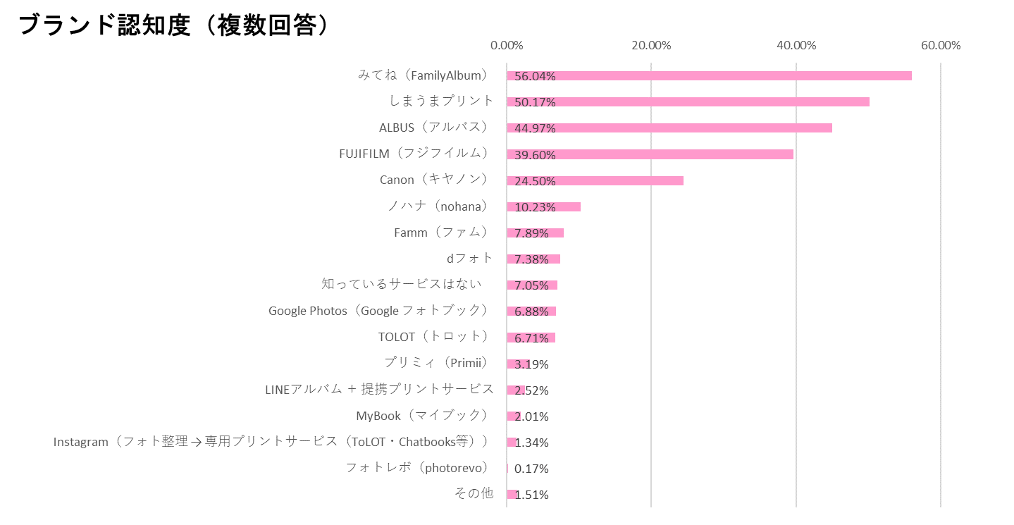 ブランド認知では、「みてね」「しまうまプリント」がともに5割超と突出しており、次いで「ALBUS」「FUJIFILM」が続いた。