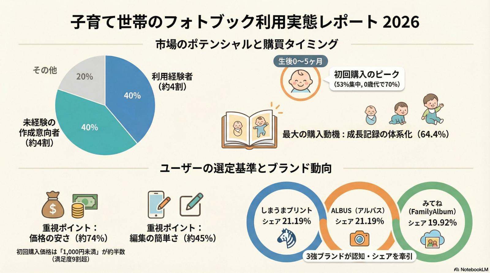 出典:『子育て世帯の「フォトブック購入」市場調査 2026~初回検討時期・重視ポイント・ブランド選択の分析~(株式会社コズレ)』