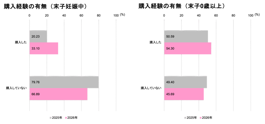 末子妊娠中の家庭において、末子のためにベビーカーを「購入した」と回答した割合は、約20%(2025年)から約33%(2026年)へと増加した。一方、末子が0歳以上の家庭における同割合は、約51%(2025年)から約54%(2026年)と大きな変化は見られなかった。