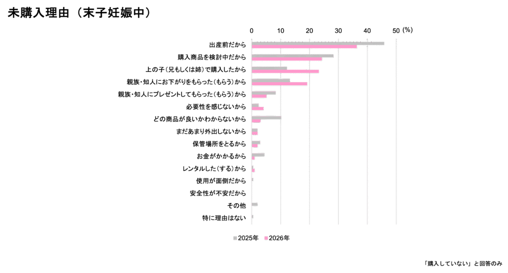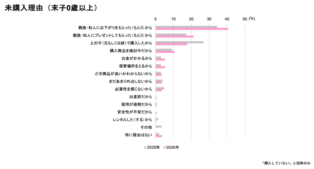末子妊娠中の家庭における未購入理由については、「出産前だから」が最多であるものの、約46%(2025年)から約36%(2026年)へと減少した。また、「購入商品を検討中だから」も上位に挙げられるが、同様に減少傾向が見られた。一方で増加が目立った理由として、「上の子で購入したから」(前年比約11%増)や、「親族・知人にお下がりをもらった(もらう)から」(前年比約6%増)が挙げられる。また、末子が0歳以上の家庭における未購入理由では、「親族・知人にお下がりをもらった(もらう)から」が40%超(2026年)と最多であり、上位3項目を「お下がり」に関する理由が占める結果となった。